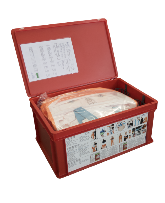 FSA18 wird als Set ausgeliefert, bestehend aus einer Transportboxe mit eingebauter Ladestation, zwei Vollschutzanzügen, einem VenION® Gebläse, den dazugehörigen Akkus und 4 ABEK P3-Filter. Das Gebläse, der Akku und die ABEK P3-Filter sind in eine eingelassene Halterung aus Schaumstoff in der Transportbox verstaut. Die beiden einsatzbereiten Vollschutzanzüge werden zuoberst mit in die Box gepackt. Der Akku wird während dem Ladevorgang in dem Ladeport geschoben und so gesichert.